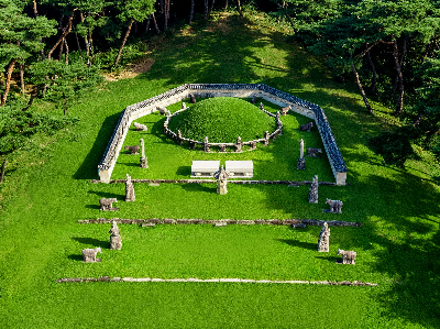 정갈한 배치와 상징적 조형으로 성군의 위엄을 보여준다.